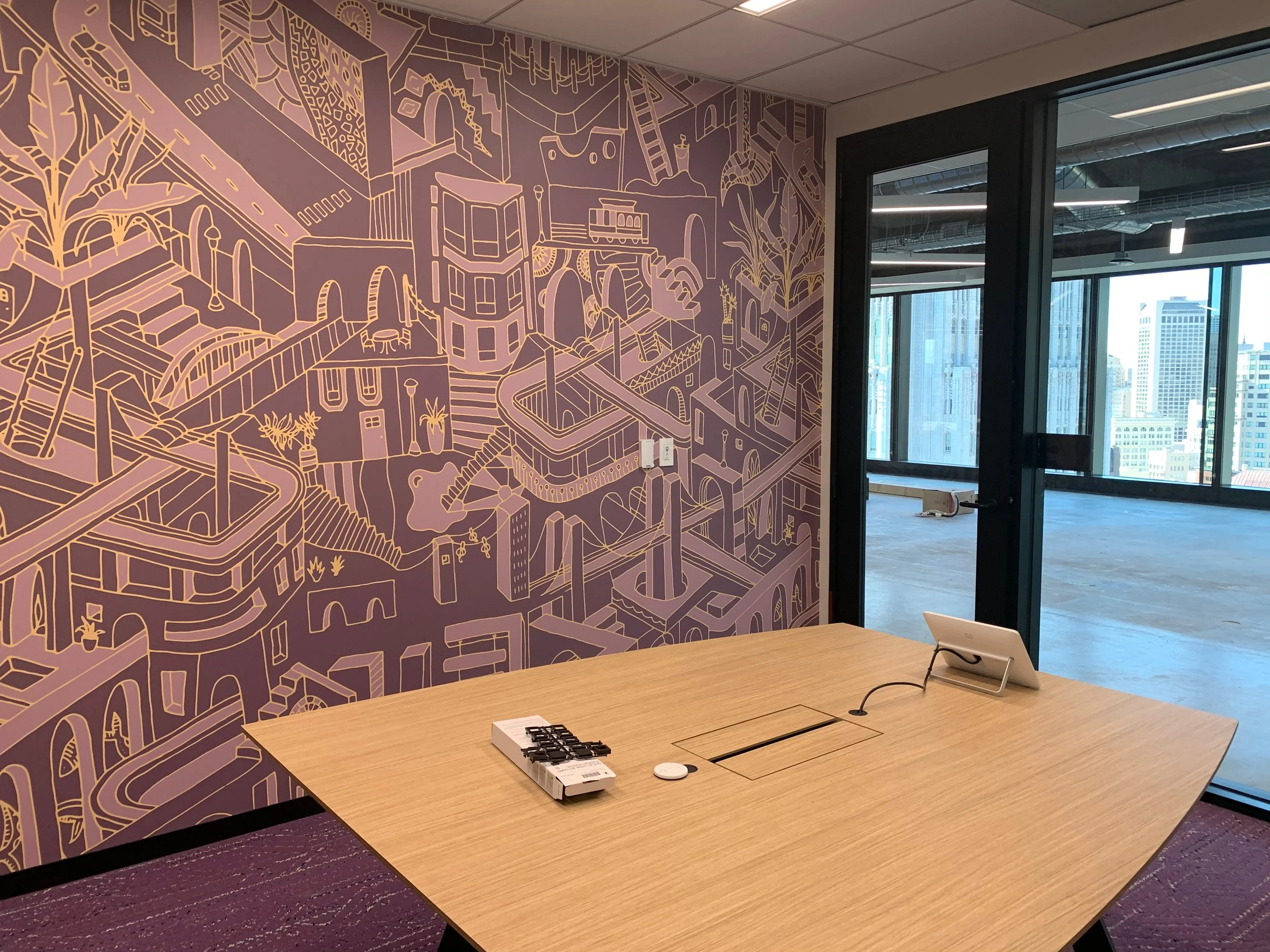 Inspired by the artistic staircases of San Francisco, this floor’s theme pulled inspiration from Arelious Walker, Sand Ladder and Vallejo St. stairs. Once elements from the locations were pulled and illustrated the pattern was created, and colored for the various locations around the office floor.